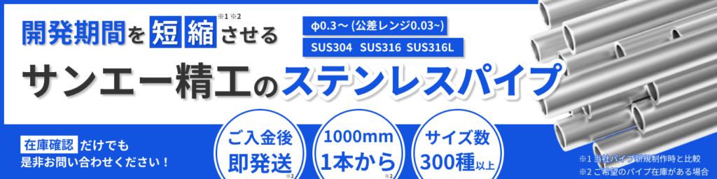 サンエー精工が創業より取り扱っているのがステンレスパイプです。主に医療機器や測定機器などに使用されている高精度のパイプです。外径φ0.3からご用意しています。また、在庫があれば即納対応が可能です。